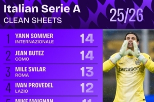 本赛季意甲零封榜:索默14次第一,迈尼昂第5、迪格雷戈里奥第7