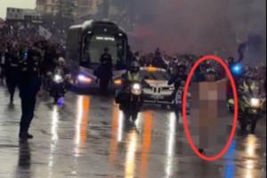欧洲德比氛围满满!TA记者现场拍摄:一名裸奔者从皇马大巴前跑过