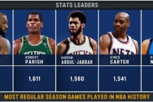 历史出场数排名:詹姆斯1612场、帕里什1611场、贾巴尔1560场、卡特1541场、诺维斯基1522场