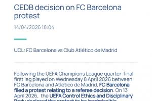 官方公告:在2026年4月8日(星期三)进行的巴塞罗那对阵马德里竞技的欧冠四分之一决赛首回合比赛后,巴塞罗那足球俱乐部就裁判的某项判罚提出了抗议。2026年4月13日,欧足联道德与纪律审查机构宣布对该抗议不予受理。