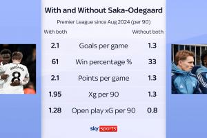 萨卡和厄德高在场时阿森纳场均2.1球+61%胜率,缺席时仅1.3球+33%